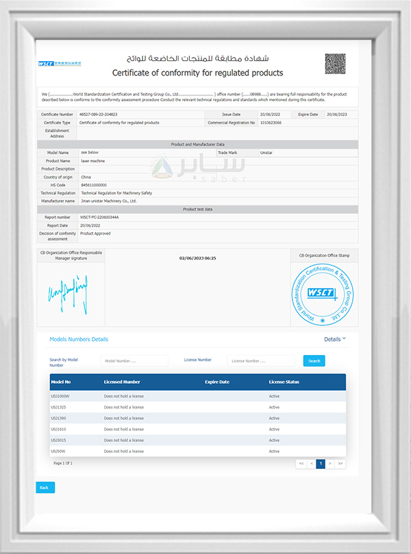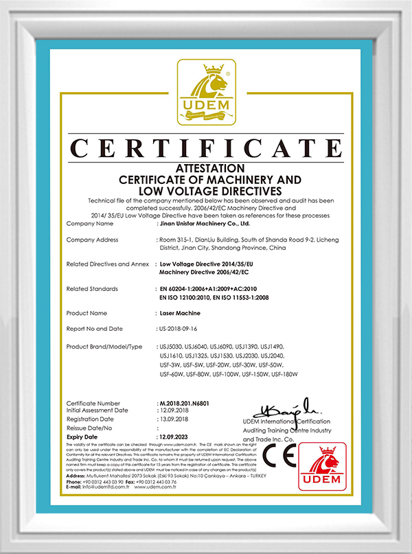 لقد حصلت معدات الليزر على شهادات CE/FDA/ISO9001/SGS/BV/TUV وغيرها من الشهادات الدولية، ولديها عدد من براءات الاختراع وبراءات نماذج المنفعة